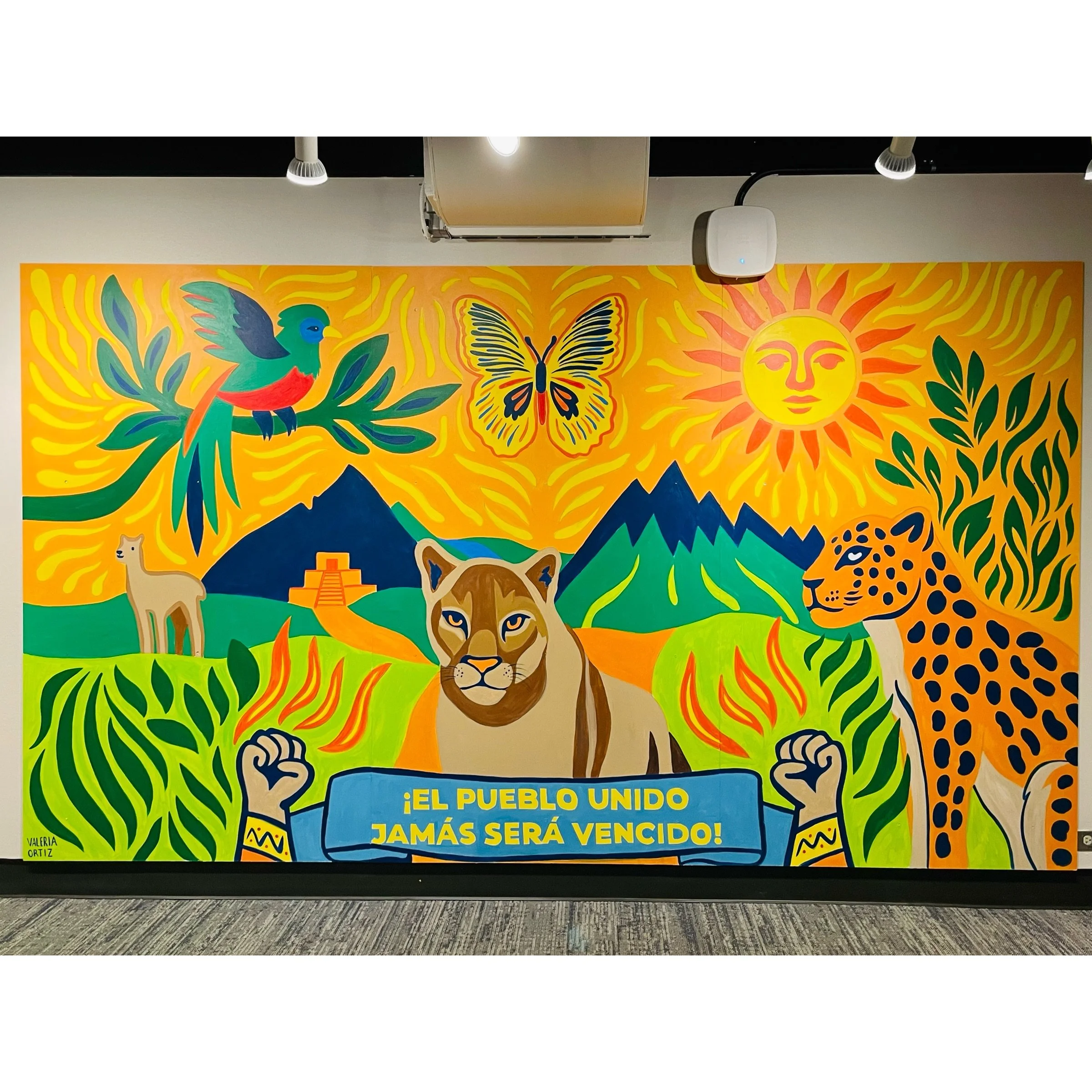 Mountains, rivers, and ancestral pyramids connect us to our heritage, while the central figures radiate joy, unity, and hope. The mural’s title “The people united will never be defeated” is a powerful call for solidarity and collective action.